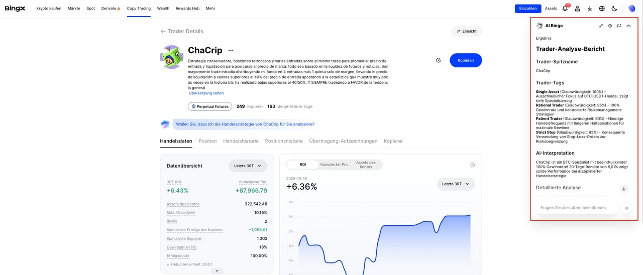 Mit drei flexiblen Kopiermodi wie Positionsverhältnis, Pro Order und Spot-Markt-Kopie kannst du festlegen, wie viel Kontrolle du über deine Trades haben möchtest. Wichtig ist, dass BingX transparente Trader-Metriken wie Gewinnrate, ROI, Drawdown und PnL-Historie bereitstellt. So triffst du fundierte Entscheidungen, bevor du jemanden kopierst. Dieses Setup passt zu strukturiertem Krypto Trading.
