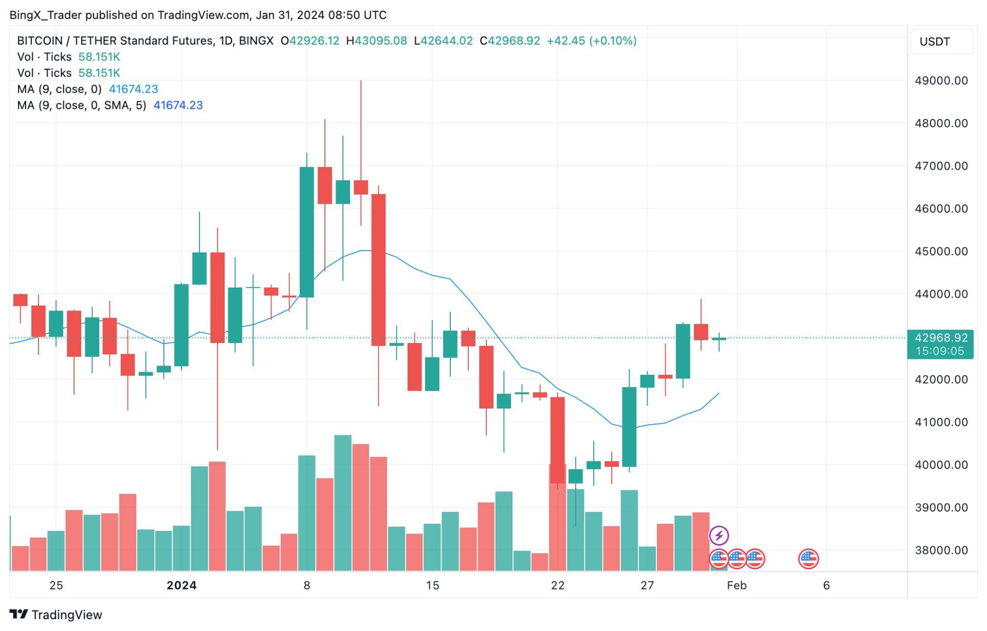 Mặt khác, BTC trên các sàn giao dịch tăng đều trong suốt tháng 1, và chỉ đảo chiều vào ngày 23/1. Từ hôm đó, các nền tảng giao dịch được theo dõi bởi Glassnode ước tính chạm mức 7,400 BTC (321 triệu USD). Trong khi trước đó, Grayscale Bitcoin Trust (GBTC) đã gửi khoảng 700 triệu USD BTC đến Coinbase mỗi ngày, số lượng rút hàng hàng ngày gần đây nhất ít hơn 200 triệu USD. Ngày 25/1 đã chứng kiến 24,000 BTC được rút ra, trong khi ngày 29/1 chỉ khoảng 6,000 BTC. Hiện tại, có tổng cộng 26 tỷ USD trong các quỹ Bitcoin ETF này và con số này được cho là sẽ tiếp tục tăng lên. Mức hỗ trợ hiện là 42,000 USD và kháng cự là 44,300 USD.