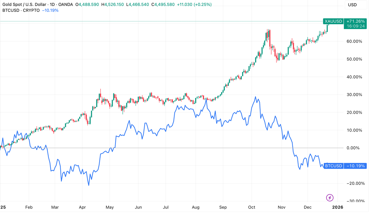 Bitcoin vs. Gold Price Chart YTD as of December 2025 | Source: TradingView