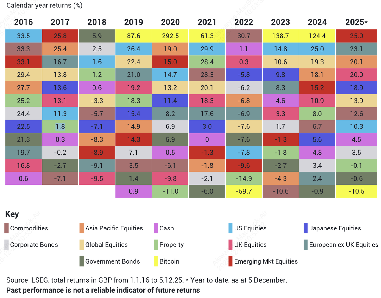 falling real interest rates. Bitcoin often underperforms during market stress but has historically delivered outsized gains during recoveries and liquidity expansions, a pattern highlighted by multiple market studies from firms like Fidelity Digital Assets. In 2025, this divergence was clear: gold rose nearly 70% year-to-date, while Bitcoin fell more than 30% from its October peak, reflecting tighter liquidity and elevated risk aversion.