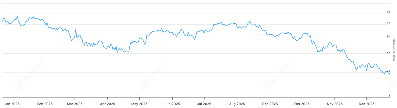 Bitcoin-to-Gold ratio falls from 37 to under 20 in 2025 | Source: LongTermTrends