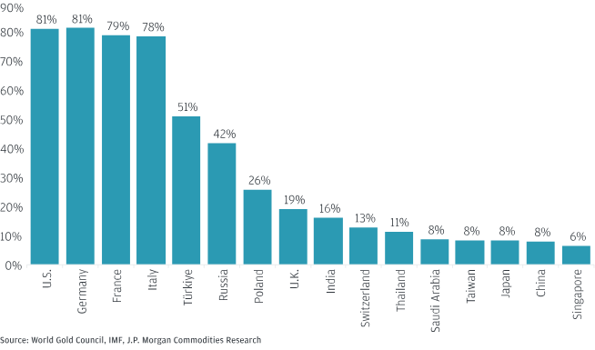 Gold as a percentage of total reserve holdings across leading central banks | Source: JP Morgan