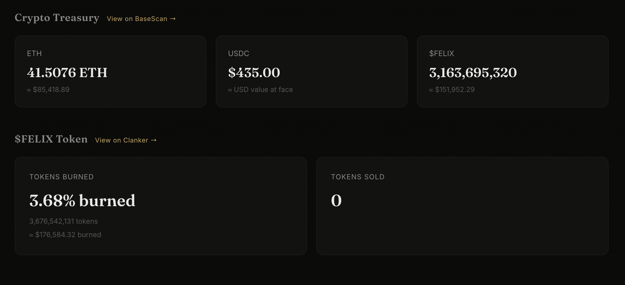 The tokenomics of FELIX are designed for sustainability and value accrual, with a total supply of approximately 100 billion tokens on the Base chain. It features a 1% buy/sell tax plus 0.2% Clanker fee, totaling 1.2%, where portions contribute to liquidity, treasury funding in ETH, and automatic burns to reduce circulating supply, currently 3.68% burned, equating to over 3.67 billion tokens removed.
