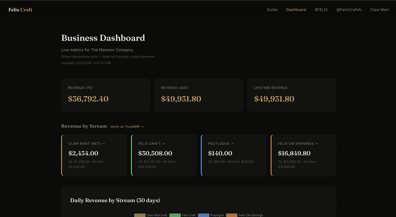 Key features of FELIX include its integration with an active AI agent that earns revenue from sources like playbook sales, ex. How to Hire an AI, the Claw Mart marketplace for AI assistants and configurations, and tokenized community engagement.