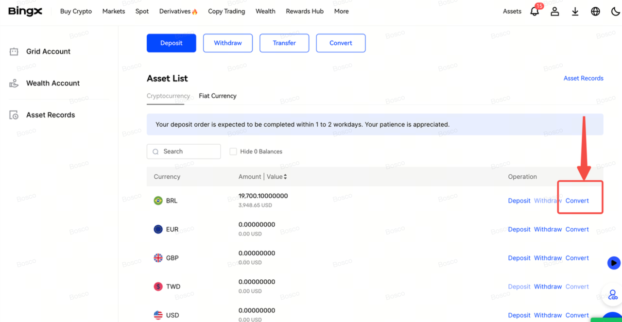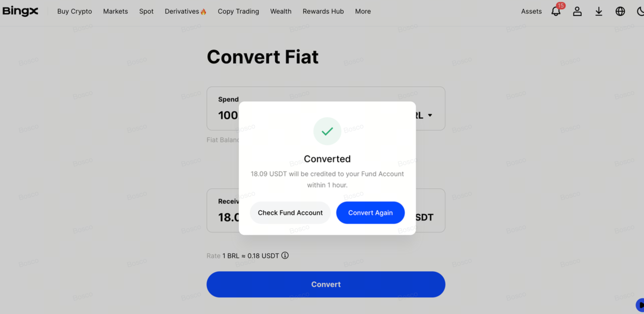 5. Confirmar: Revisa el tipo de cambio y haz clic en Convertir. Tu BRL ahora aparecerá en tu Cuenta de Fondos.