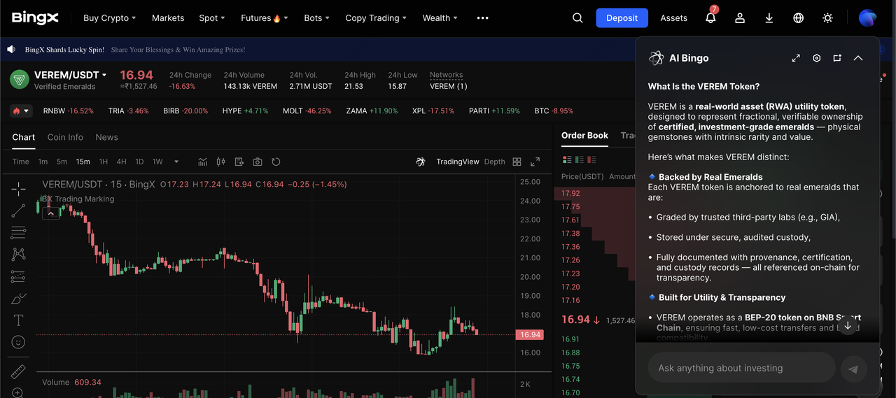 Verified Emeralds (VEREM) est tradé sur le marché Spot BingX sous la paire de trading VEREM/USDT. Le trading est amélioré par