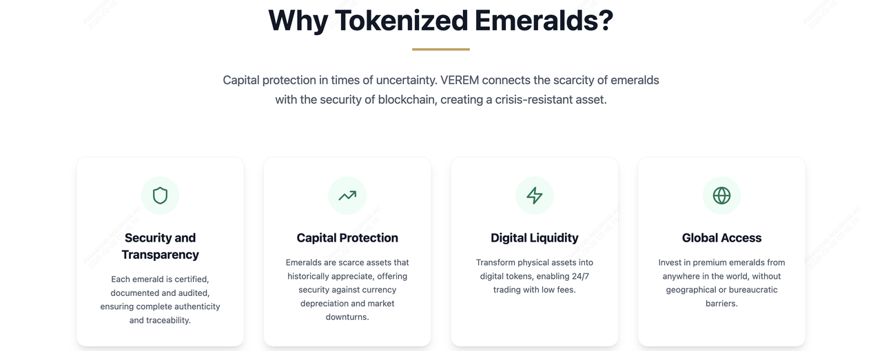 VEREM remplace le marché traditionnel opaque et illiquide des gemmes par un modèle de tokenisation rationalisé et programmable. Le processus garantit que pour chaque token en circulation, il y a une valeur correspondante en émeraudes physiques détenues en réserve.