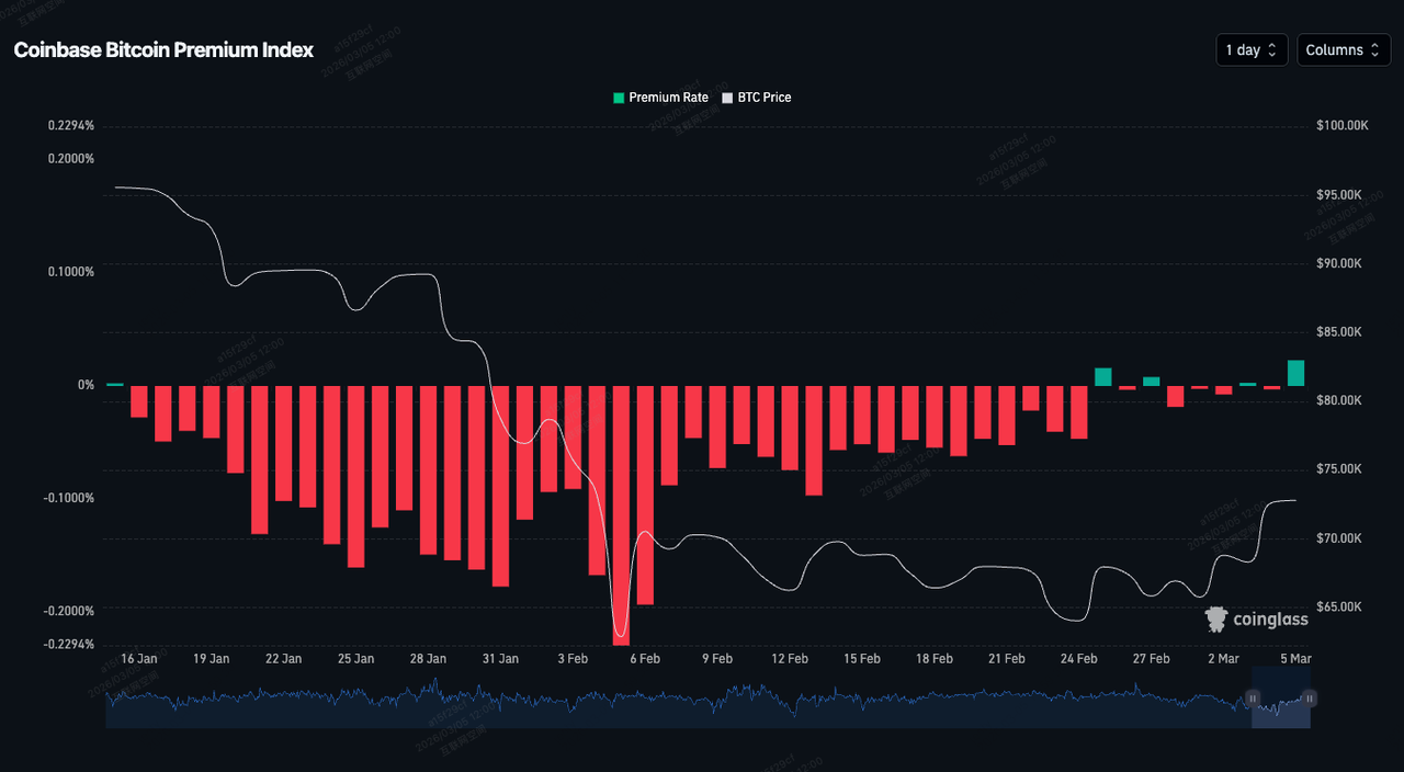 Coinbase Bitcoin Premium Index telah kembali positif, mencatat +0,0227% per 5 Maret, mengakhiri rentang 40 hari di wilayah negatif. Selama periode tersebut, Bitcoin diperdagangkan dengan diskon di Coinbase dibandingkan dengan exchange global, mencerminkan permintaan AS yang lemah dan posisi hati-hati dari partisipan pasar Amerika.