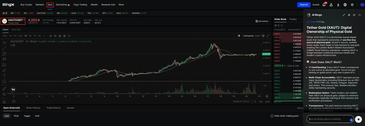 長期的なXAUTポジションを構築する場合でも、短期的なボラティリティを取引する場合でも、主要なニュースイベントに反応する場合でも、BingXはトークンを取引するための柔軟な方法を提供します。BingX AIが取引インターフェースに直接統合されているため、現物市場と先物市場の両方で、よりスマートな取引決定をサポートするリアルタイムの洞察にアクセスできます。