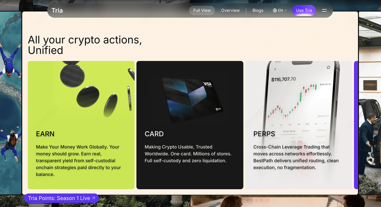 Triaは、オンチェーン金融を実用的で日常的なツールに変革するセルフカストディアル暗号通貨ネオバンクです。カストディアルネオバンクや中央集権取引所とは異なり、Triaはサードパーティのカストディアンに依存することなく、ユーザーが自分の資産を完全にコントロールできることを保証します。プラットフォームは、世界中の数百万の加盟店で受け入れられるVisaカードでの暗号通貨支出、監査済みオンチェーン戦略による利回り獲得、200以上のブロックチェーンにわたる資産取引をサポートし、すべてガス料金なし、シードフレーズなし、最小限の摩擦で実現します。