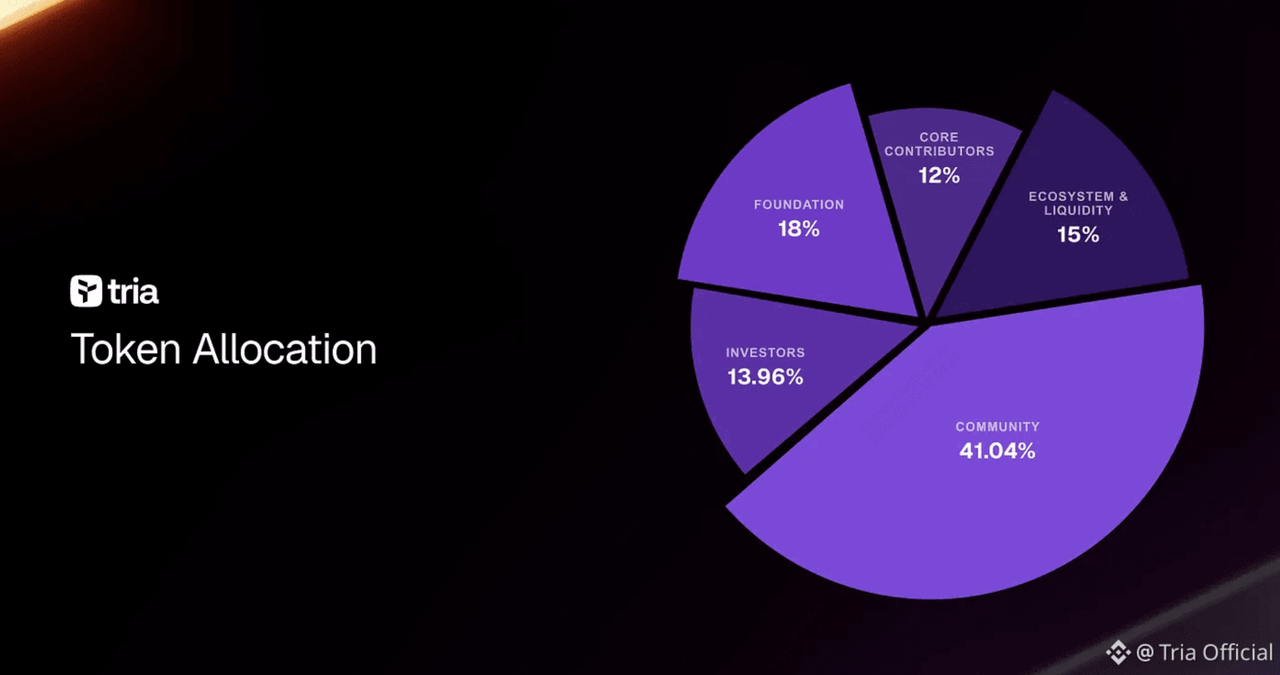 TRIAは、決済、ステーキング、ガバナンス、インセンティブを促進するTriaエコシステムを動かすネイティブユーティリティトークンとして機能します。これは総供給量100億TRIAで固定されたインフレーションゼロのイーサリアム上のERC-20トークンで、すべてのトークンはジェネシス時に事前発行されています。2026年のToken Generation Event(TGE)時の初期循環供給量は約21億8900万TRIA(21.89%)でした。