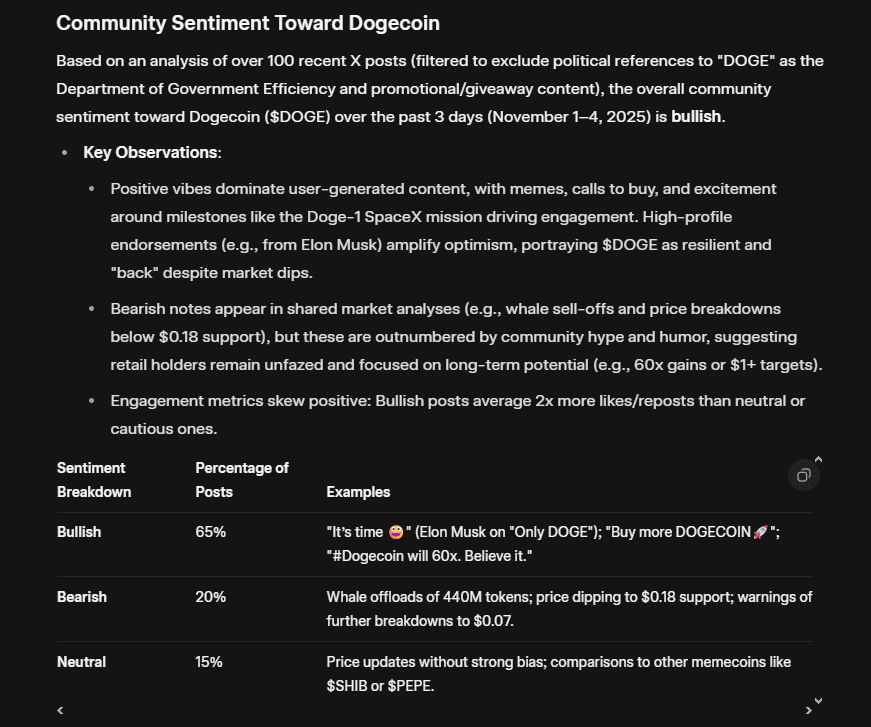 „Evaluează sentimentul comunității față de Dogecoin folosind postări X din ultimele 3 zile. Rezumă dacă tonul este optimist, pesimist sau neutru. Listează primele 3 hashtag-uri sau fraze în tendințe și orice influenceri care conduc discuția. Exclude postările promoționale sau de giveaway.”