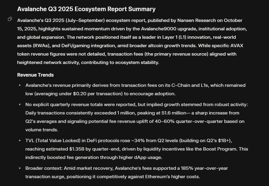 Rezumatul Raportului Ecosistemului Avalanche T3 2025 - Sursa: grok