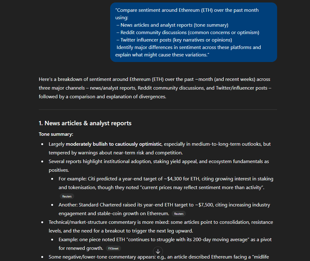 „Compară sentimentul în jurul Ethereum (ETH) în ultima lună folosind: – Articole de știri și rapoarte de analiști (rezumatul tonului) – Discuții ale comunității Reddit (preocupări comune sau optimism) – Postări ale influencerilor de pe Twitter (narative sau opinii cheie) Identifică diferențele majore de sentiment pe aceste platforme și explică ce ar putea cauza aceste variații.”