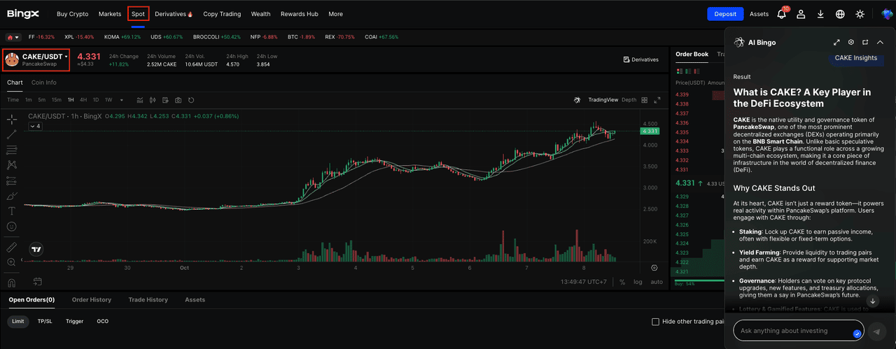 Торгова пара CAKE/USDT на спотовому ринку на базі BingX AI