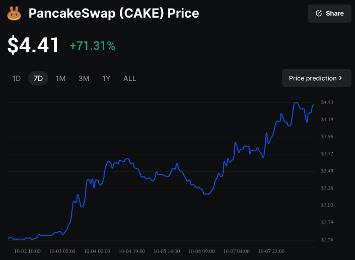 PancakeSwap (CAKE) зросла більш ніж на 70% за один тиждень у жовтні 2025 року | Джерело: BingX