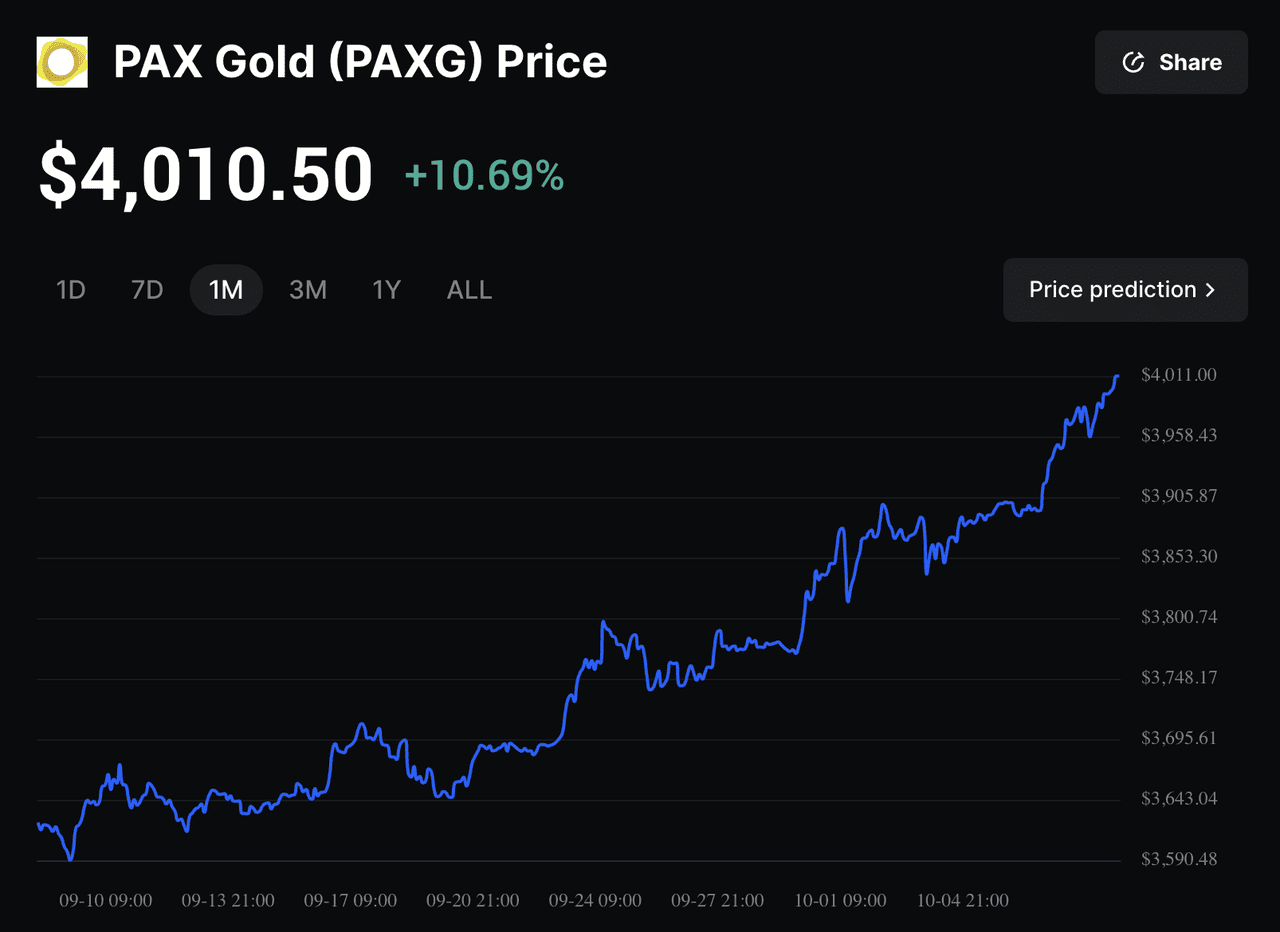 Станом на 7 жовтня 2025 року ринкова капіталізація криптотокенів, забезпечених золотом, вперше перевищила 3 мільярди доларів, що збіглося з тим, що ціни на фізичне золото перетнули позначку в 4000 доларів за унцію. За даними The Block від 7 жовтня 2025 року, ця віха відображає зростання інтересу інвесторів до