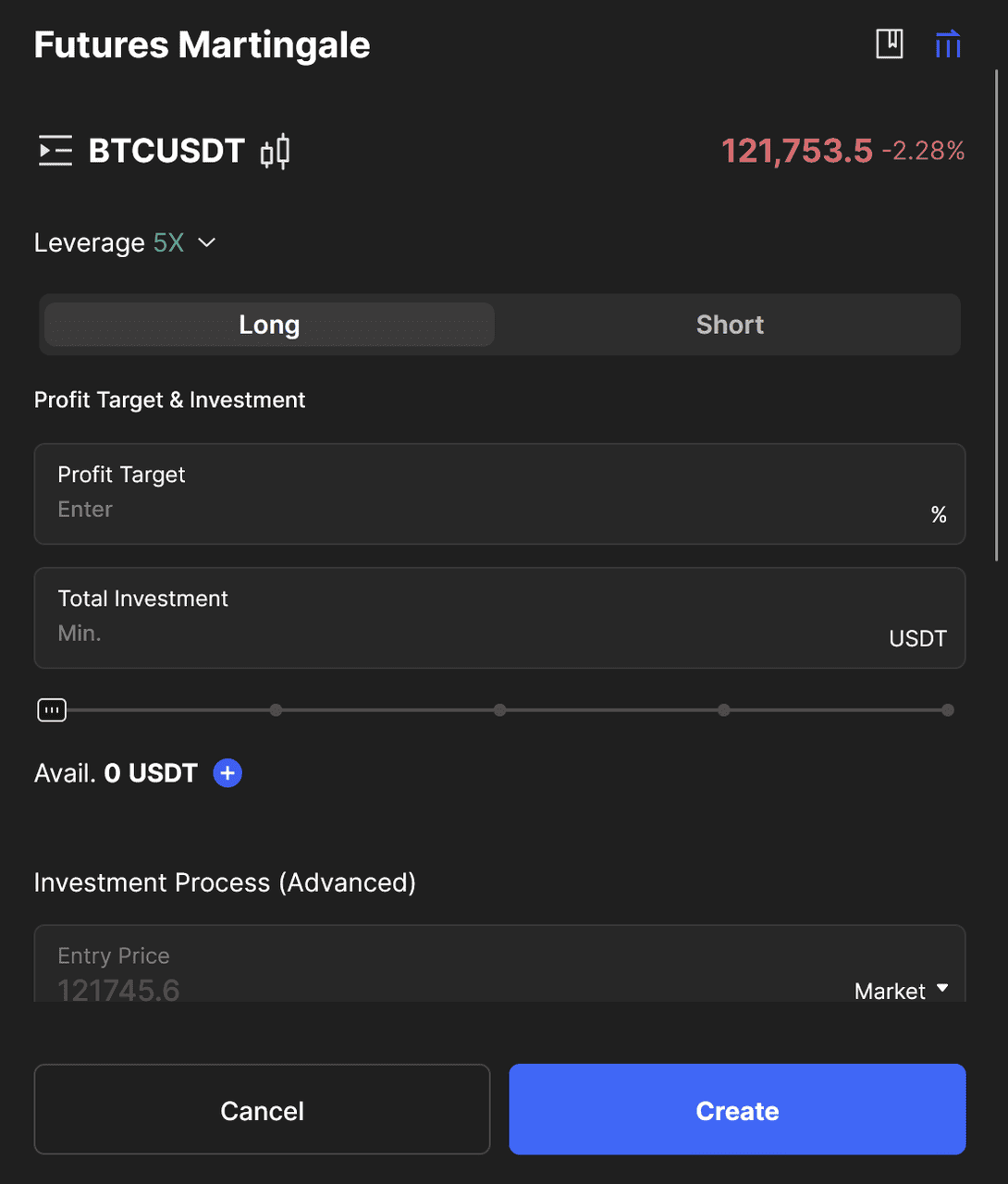 Розглянемо реальний приклад. Припустімо, Біткоїн торгується за $121 753, і ви запускаєте Futures Martingale на BTCUSDT з кредитним плечем 5x, кроком ціни 1% та множником кількості 1.1x.