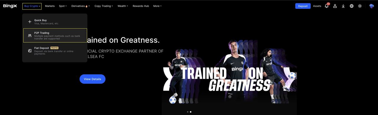 - Đăng nhập vào tài khoản BingX của bạn và điều hướng đến mục Giao dịch P2P