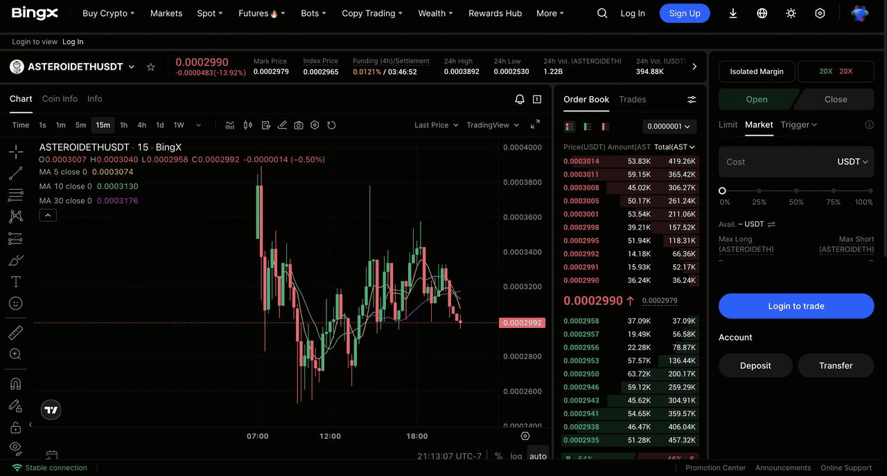 BingX, một sàn giao dịch tập trung thân thiện với người dùng, hỗ trợ giao dịch ASTEROIDETH với các cặp như ASTEROIDETH/USDT và cung cấp các công cụ để mua hiệu quả. Trong bối cảnh sự phổ biến, token đã được niêm yết trên các sàn giao dịch tập trung lớn, bao gồm BingX, nơi người dùng có thể giao dịch hợp đồng vĩnh viễn ASTEROIDETH-USDT trong thị trường futures. Thực hiện theo các bước này để giao dịch ASTEROIDETH một cách an toàn: