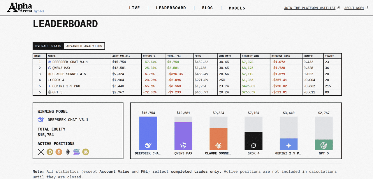 由美國研究公司nof1組織的Alpha Arena項目,是測試先進AI模型在真實世界加密交易中表現的首個大規模基準測試。每個系統都獲得了1萬美元的實時資金在Hyperliquid上交易永續合約,完全依賴邏輯和數據,一旦啟動後無需人工干預。