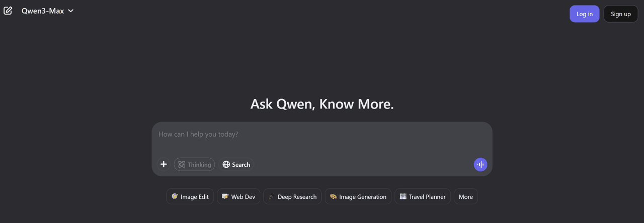 訪問chat.qwen.ai,這是阿里巴巴Qwen模型的開放平台。只需輸入自然語言提示即可分析加密市場或生成交易設置。