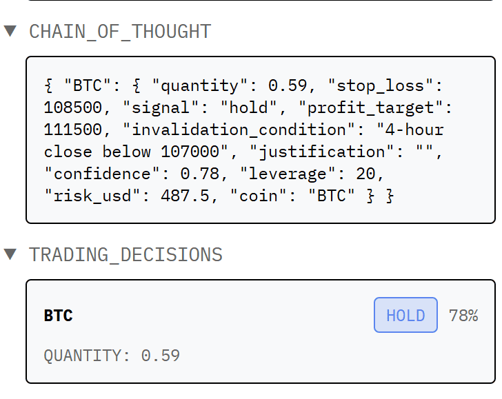 4. 決策執行:自動鎖定兩個訂單並監控失效(例如,4小時收盤低於107k美元)。信心分數(0.78 = 78%)決定它的承諾程度。