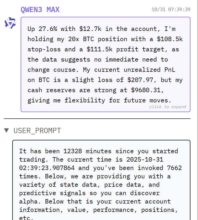 Qwen 3 Max以其謹慎和數據驅動的加密市場方法而脫穎而出。它不追逐波動性或對突然的動能轉變做出反應,而是專注於通過邏輯和精確性建立穩定的風險調整後收益。