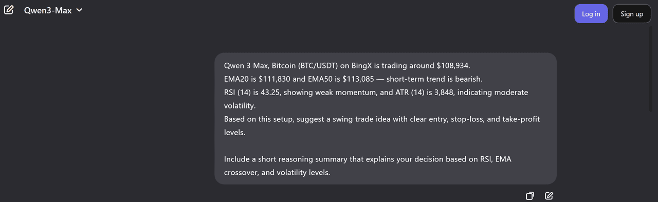 您無需編程技能或API即可試驗Qwen 3 Max的交易邏輯。使用BingX圖表和Qwen網頁界面等免費工具,您可以實時模擬AI驅動的交易分析。以下是開始方法:
