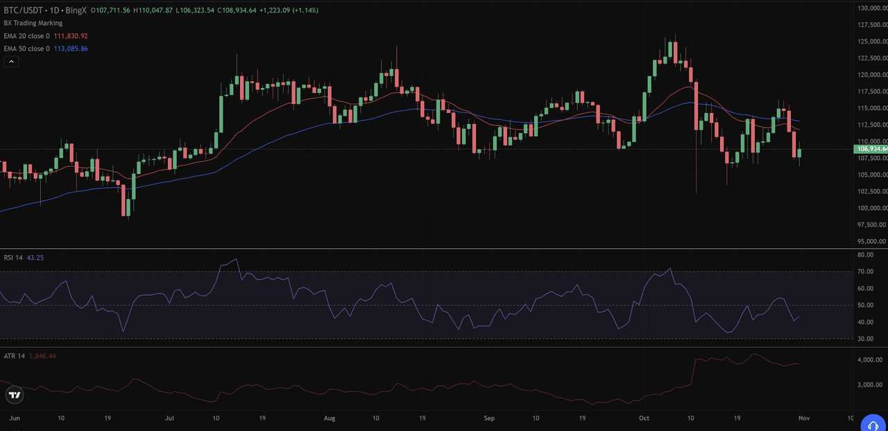 將建議與您的BingX圖表進行比較。20-EMA仍低於50-EMA,RSI位於50以下,ATR顯示穩定波動性,所有這些都確認了在109K附近的看跌做空設置。