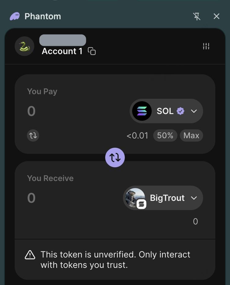 6. 交換並確認:點擊交換,在錢包中批准,並等待確認。BIGTROUT 將出現在您的錢包代幣清單中。您可能需要在 Phantom 中手動「顯示」該代幣。