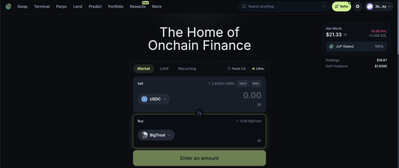 Jupiter 是在 Solana 上鏈上購買 BIGTROUT 的高效方式,因為它會自動在多個流動性池中為您的交易找到路由,以獲得最佳可用價格和深度。