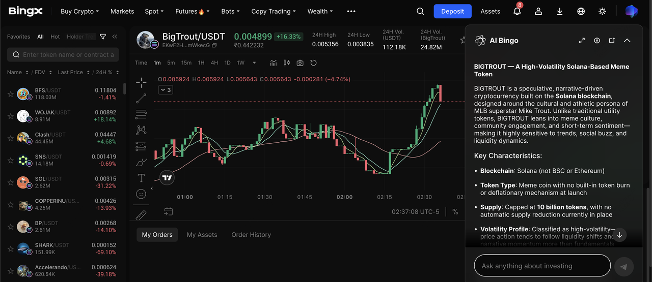 您可以通過 BingX ChainSpot 直接交易 BIGTROUT,這是一個連接您的 BingX 現貨帳戶與鏈上 Solana 流動性的 CeDeFi 功能。只需登入,導航到市場 > 現貨 > ChainSpot,並搜索 BIGTROUT/USDT 交易對。這允許您交易鏈上代幣,無需外部 Web3 錢包或持有原生 SOL 作為 Gas 費用。